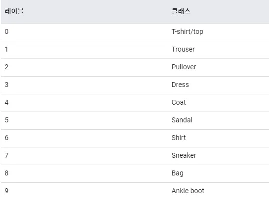class_names = ['T-shirt/top', 'Trouser', 'Pullover', 'Dress', 'Coat',